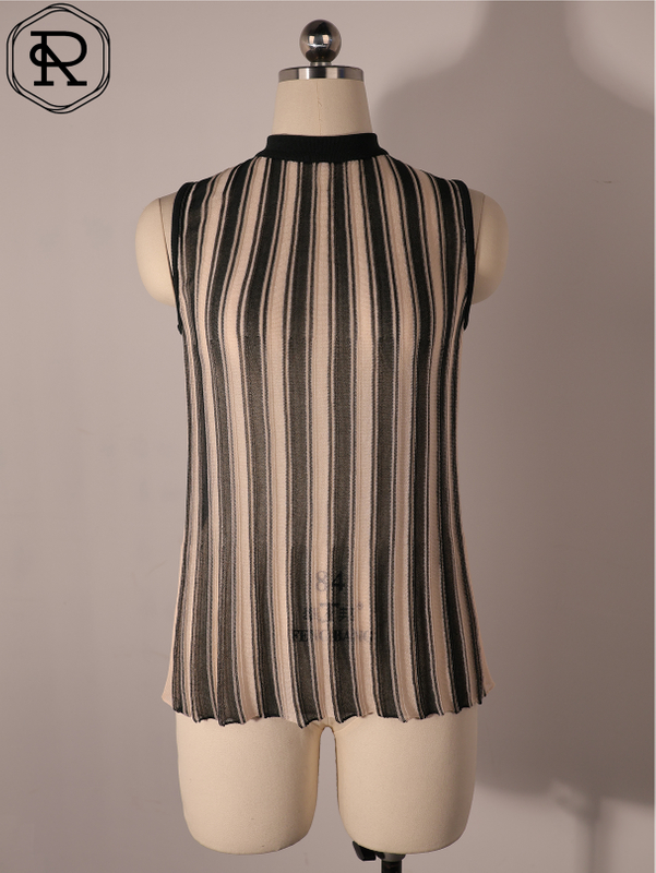 这款无袖针织上衣采用黑色和裸色对比鲜明的垂直条纹图案。该服装采用半透明挑窿针织纹理精制而成,打造出精致的网状外观,增添视觉深度和现代魅力。